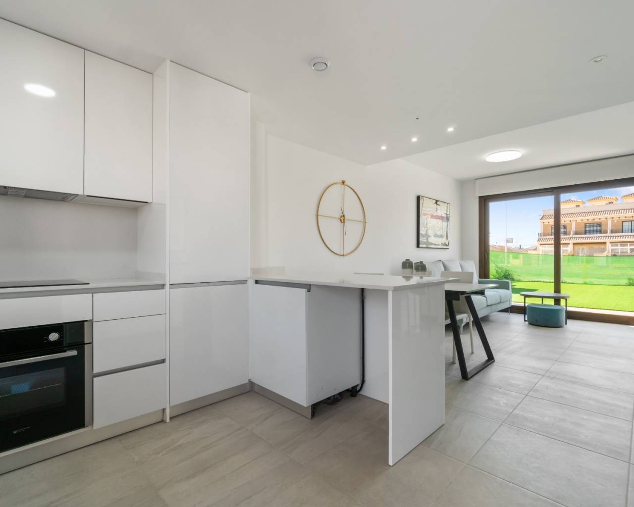 Este apartamento en planta baja consta de una sala de estar de planta abierta con puertas que dan a la terraza y al jardín con vistas a los jardines comunitarios y la piscina, una cocina moderna con electrodomésticos empotrados que incluyen horno, vitrocerámica, extractor, frigorífico/congelador y lavavajillas, un dormitorio principal con armarios empotrados y baño en suite, otro dormitorio doble con armarios empotrados y un baño de invitados. También hay aparcamiento privado fuera de la carretera en la parte trasera de la propiedad.