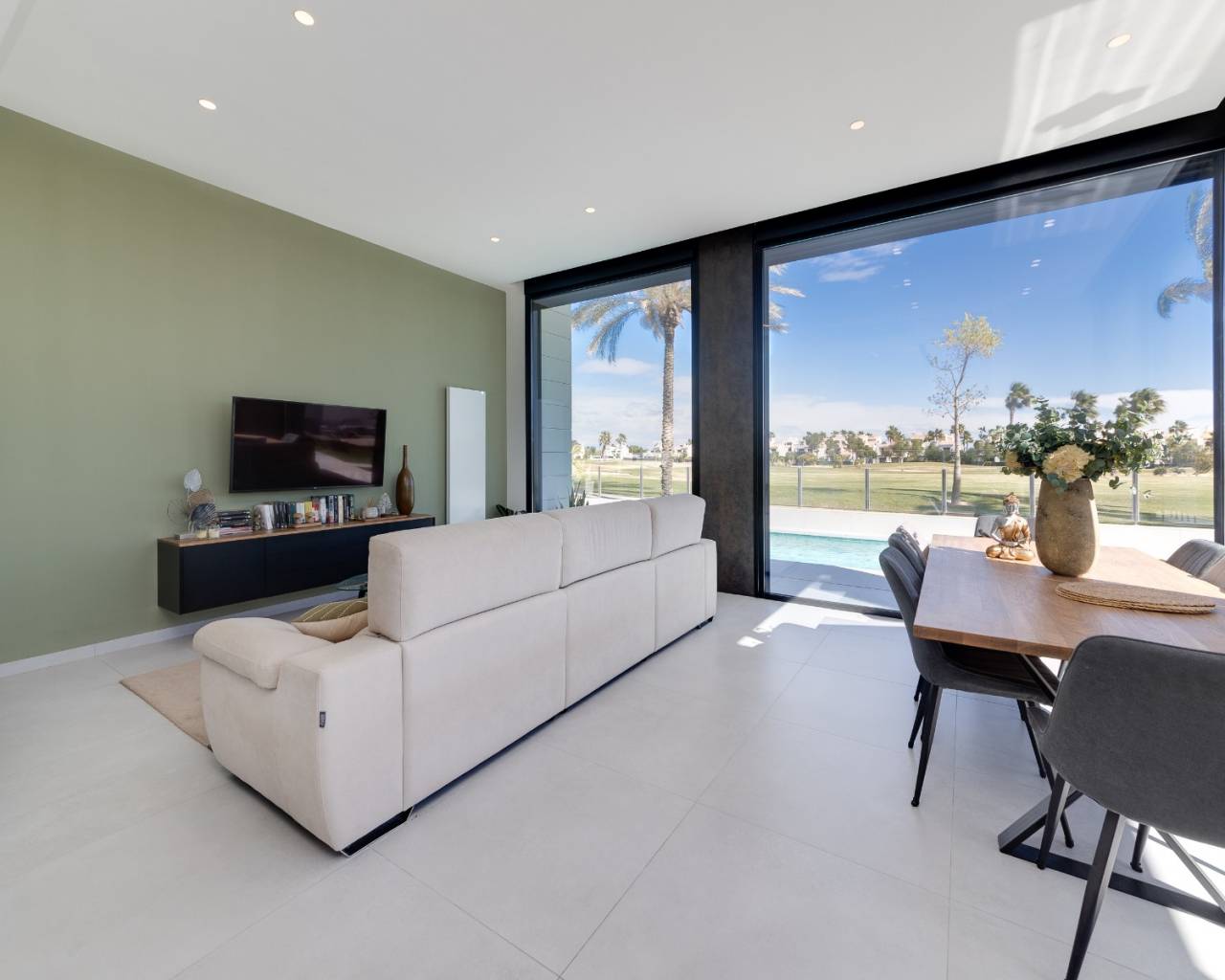 Esta moderna villa está construida en un solo nivel y consta de un salón / comedor con puertas de patio de ancho completo que conducen al jardín completo con una piscina privada, una cocina abierta con electrodomésticos equipados que incluyen horno, vitrocerámica, extractor, frigorífico / congelador integrado y lavavajillas, lavadora y microondas, un dormitorio principal con armarios empotrados y baño en suite, dos dormitorios más y un baño completo.