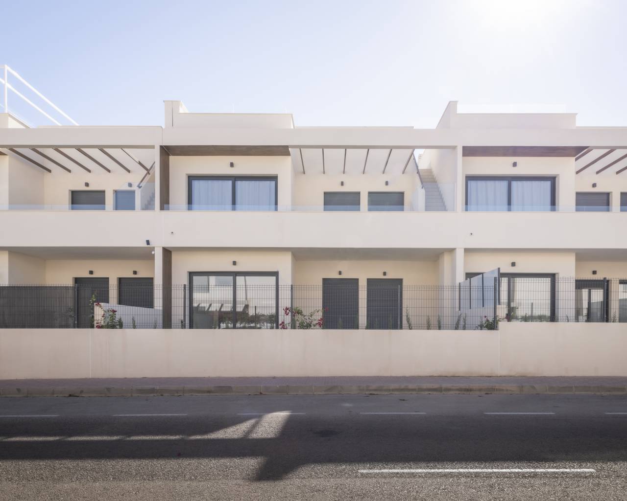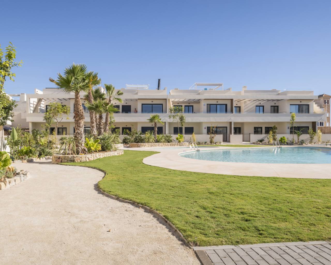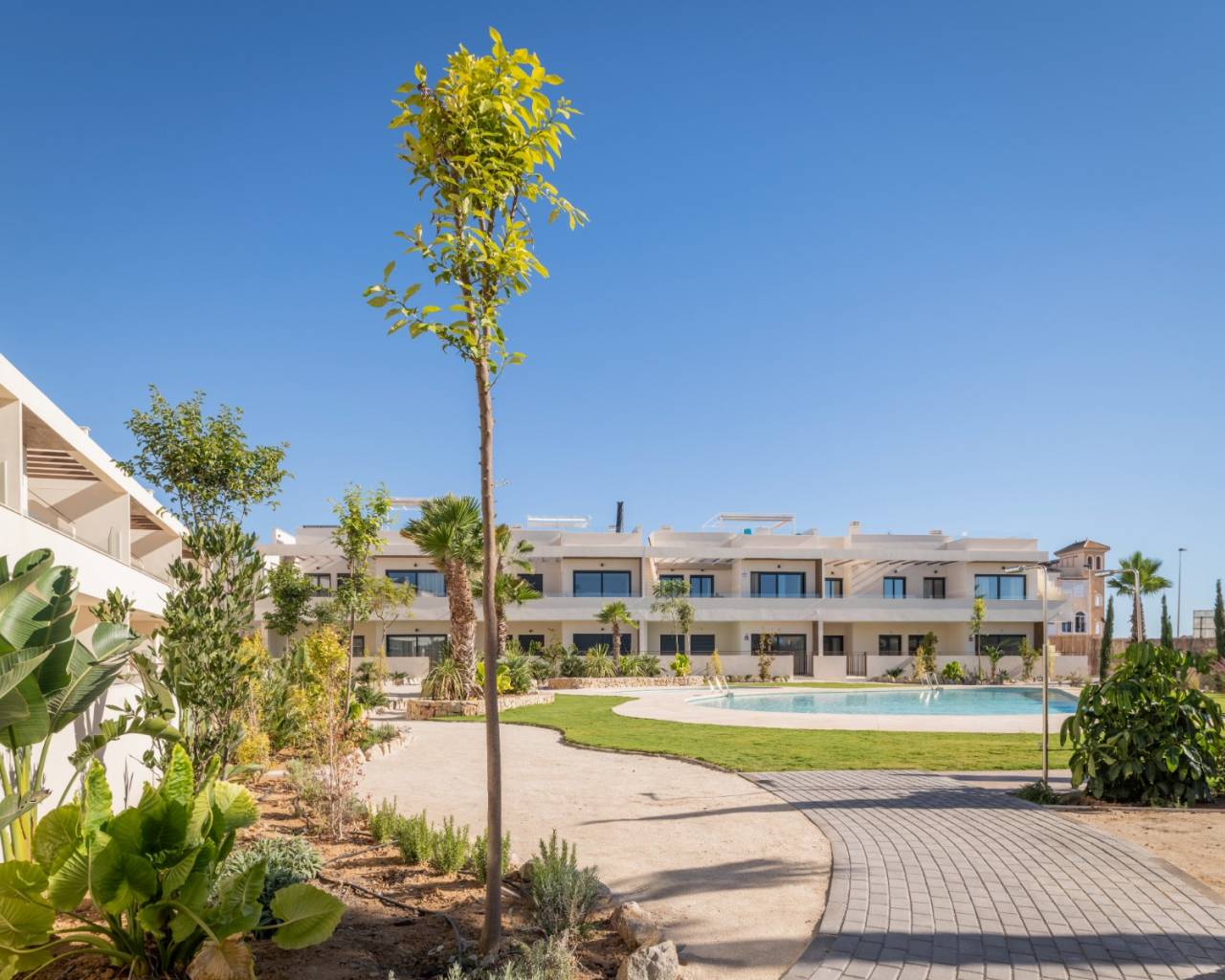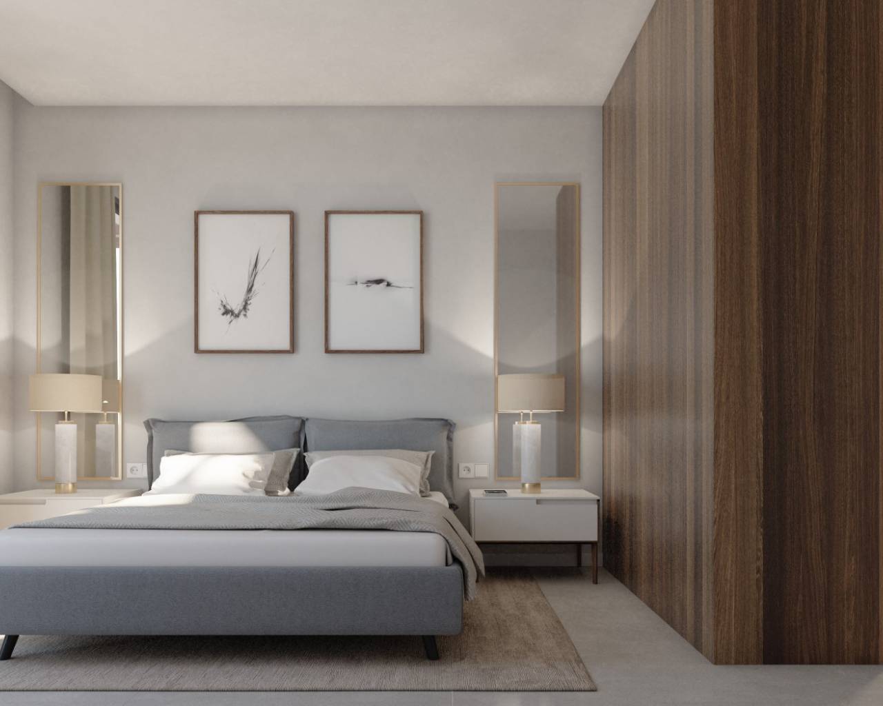 Este apartamento en planta baja consta de un salón diáfano con puertas que dan al amplio jardín, comedor, cocina moderna con electrodomésticos como horno, vitrocerámica, extractor, frigorífico/congelador, lavavajillas y microondas, lavadero, un amplio dormitorio principal con vestidor y baño en suite, otro dormitorio con armarios empotrados y un baño de invitados. También existe la opción de añadir una piscina privada a los apartamentos de la planta baja.