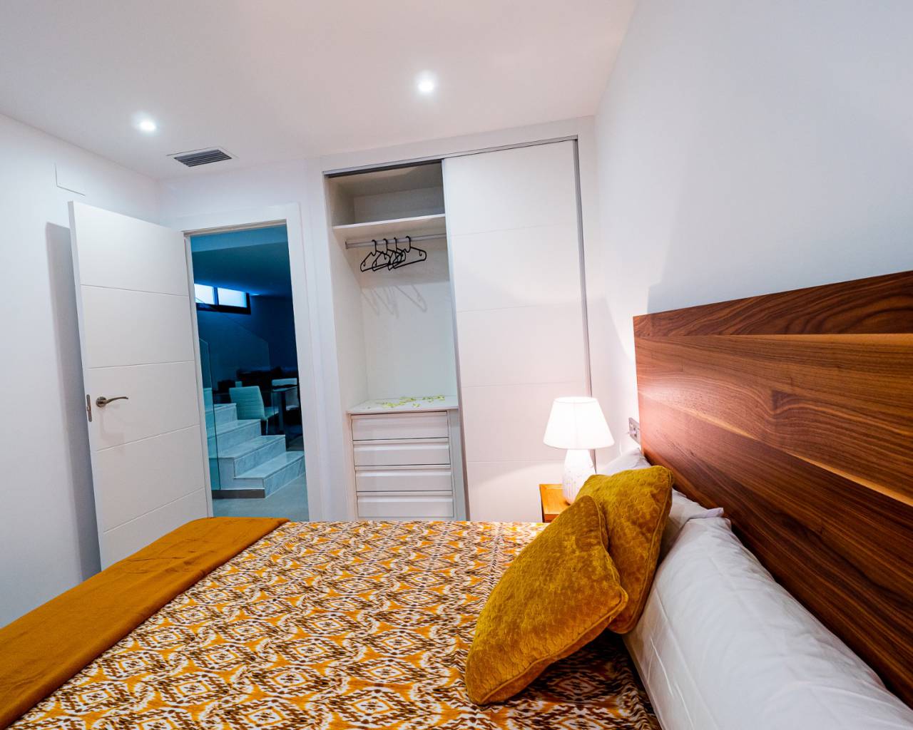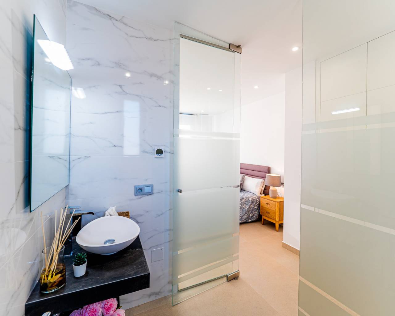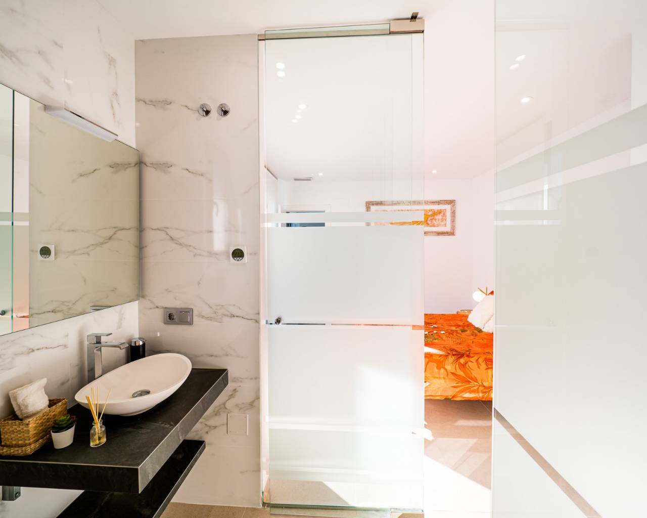 En la primera planta hay dos dormitorios más con armarios empotrados y cada dormitorio tiene su propio baño en suite y acceso a la terraza superior.