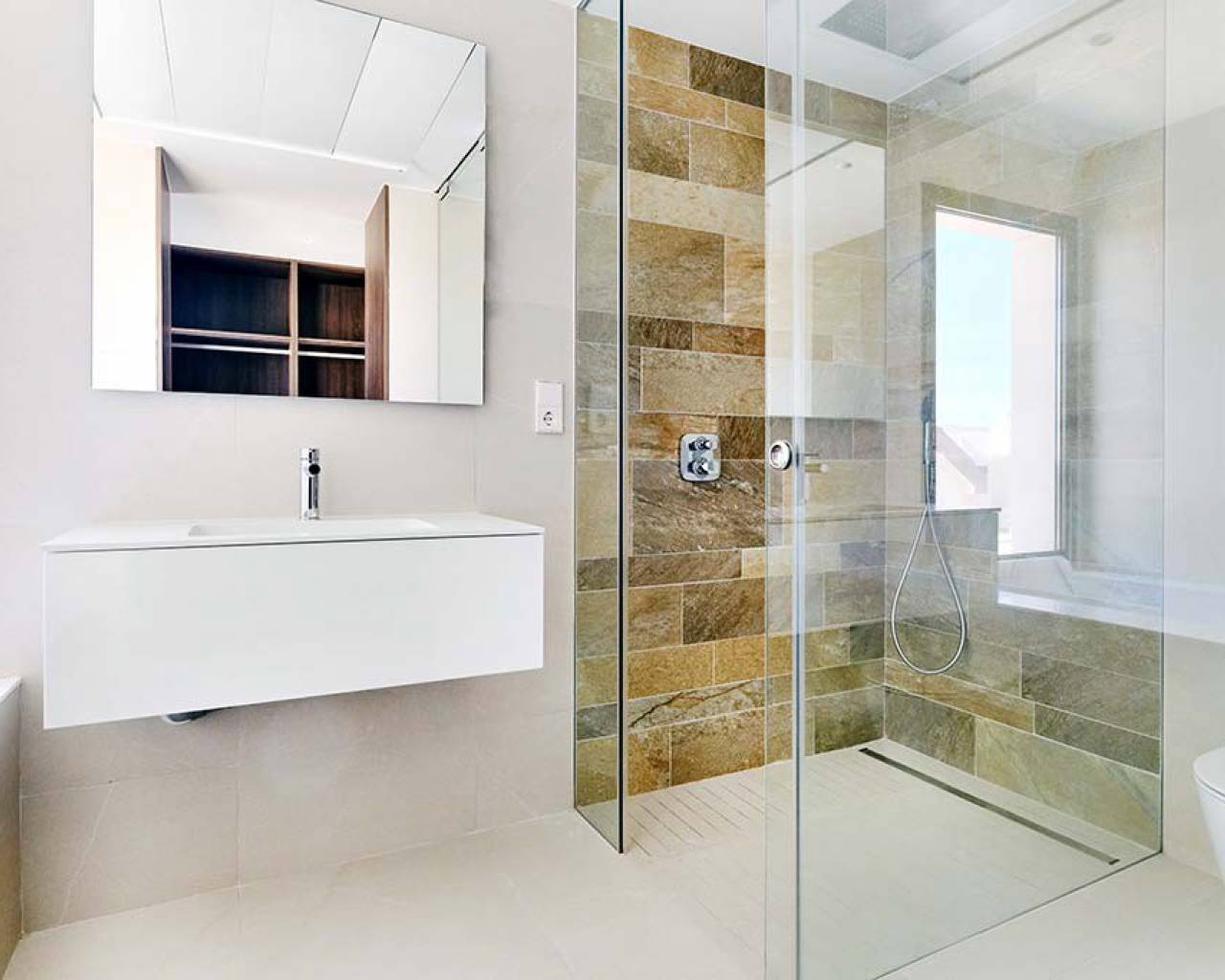 En el primer piso se encuentra el dormitorio principal con vestidor, baño en suite con bañera y una terraza privada en la parte superior.
