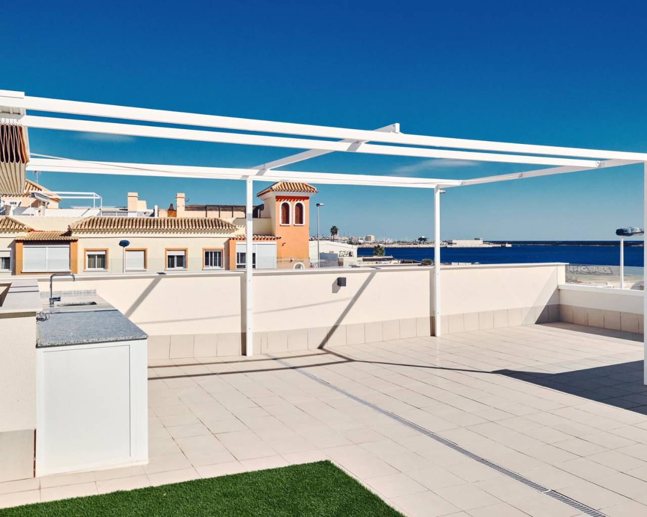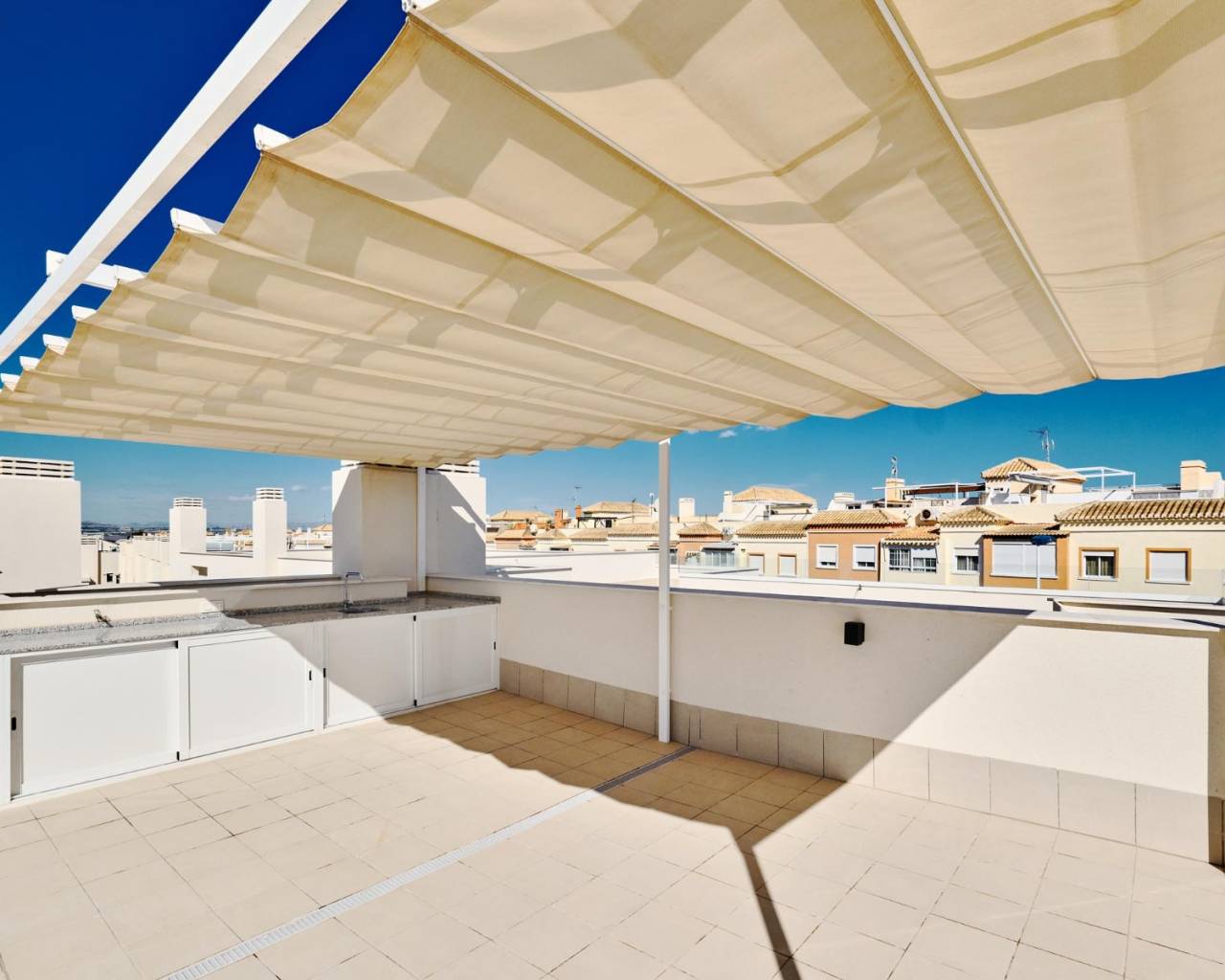 Ce penthouse comprend un séjour ouvert avec portes-fenêtres donnant sur la terrasse, une salle à manger, une cuisine moderne équipée d'électroménagers intégrés (four, plaques de cuisson, hotte aspirante, réfrigérateur-congélateur, lave-vaisselle et micro-ondes), une buanderie, une spacieuse suite parentale avec dressing et salle de bains attenante, une autre chambre double avec placards intégrés et une salle de bains pour invités. Depuis la terrasse, un escalier mène à la spacieuse terrasse privée sur le toit, d'où vous pourrez profiter d'une vue imprenable et d'un ensoleillement optimal toute la journée.