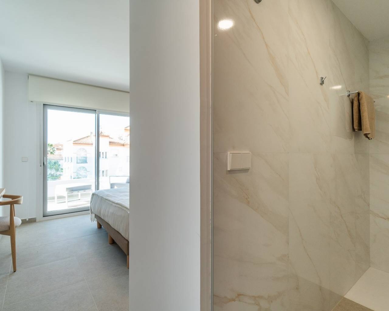 Cet appartement penthouse de trois chambres se compose d'un salon spacieux avec des portes-fenêtres donnant sur la grande terrasse, une cuisine américaine moderne avec des appareils comprenant un four, une plaque de cuisson, une hotte, un réfrigérateur/congélateur, un lave-vaisselle, un lave-linge et un micro-ondes, un coin repas, une chambre principale avec placards, salle de bain attenante et accès à la terrasse, deux autres chambres doubles avec placards et une salle de bain entièrement équipée.
