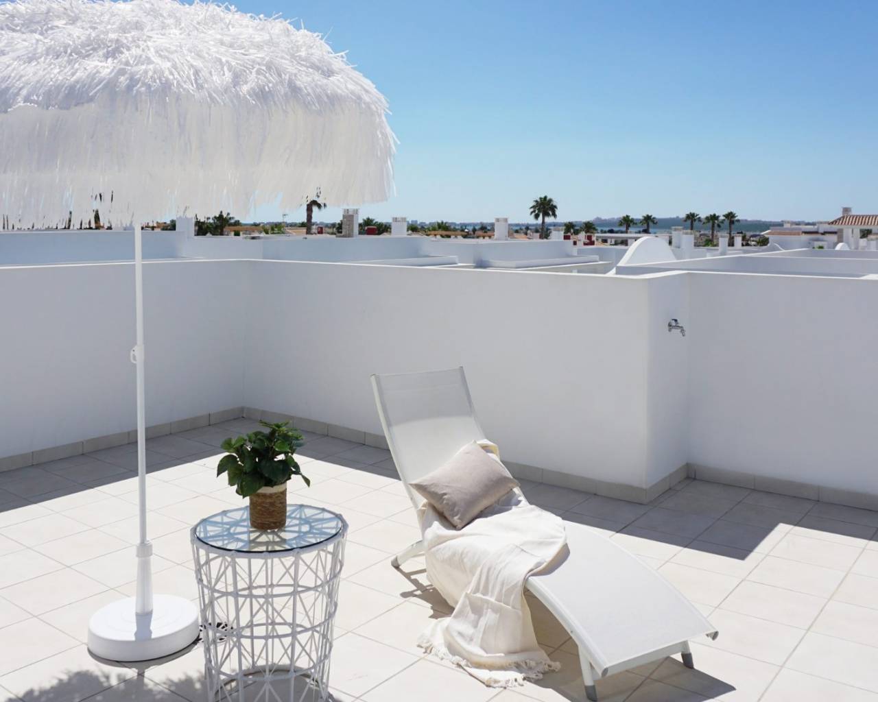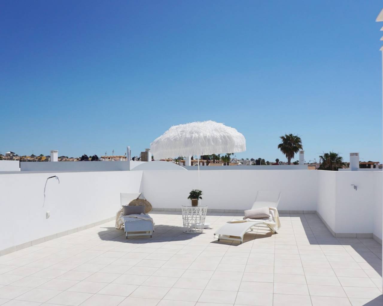 Dit luxe penthouse met 2 slaapkamers heeft een mooie open woonkamer met openslaande deuren naar het zonnige terras, een modern ingerichte keuken met inbouwapparatuur waaronder oven, kookplaat, afzuigkap, koelkast/vriezer, vaatwasser, wasmachine en magnetron, een hoofdslaapkamer met ingebouwde -inbouwkasten en en-suite badkamer, nog twee tweepersoonsslaapkamers met ingebouwde kasten en een gastenbadkamer. De trap leidt naar het privésolarium op het dak waar u de hele dag van de zon kunt genieten.