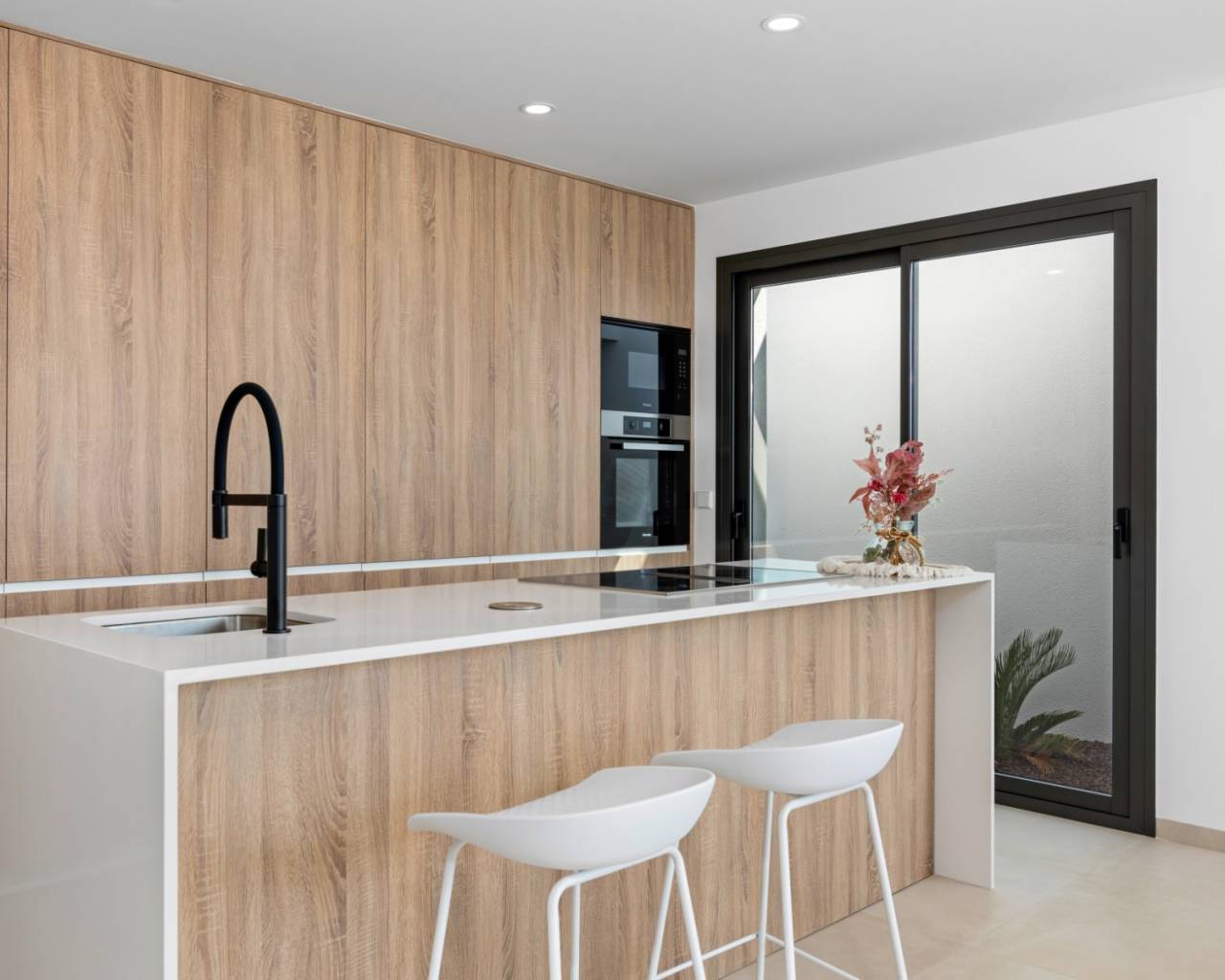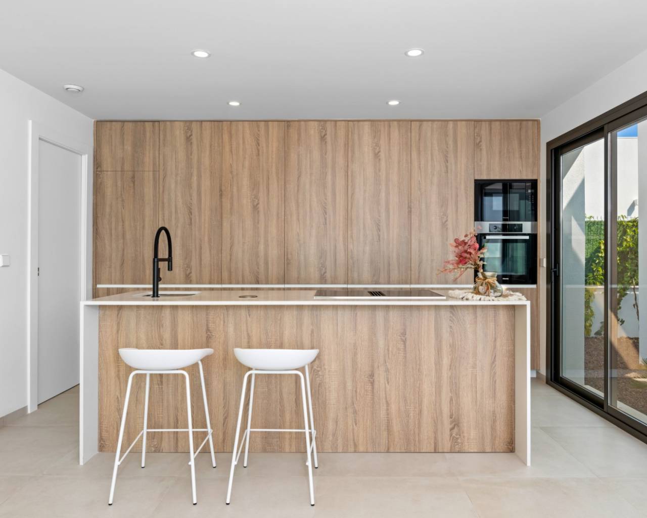 Deze villa is geheel gelijkvloers gebouwd op een groot hoekperceel en bestaat uit een woon-/eetkamer met openslaande deuren naar de tuin en het terras met privézwembad, een moderne open keuken met inbouwapparatuur, waaronder een oven, kookplaat, afzuigkap, koel-/vriescombinatie en magnetron.