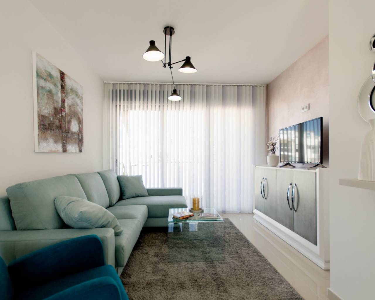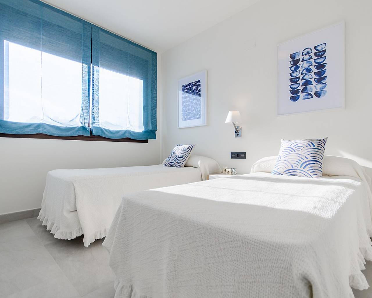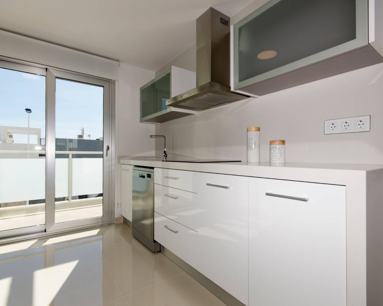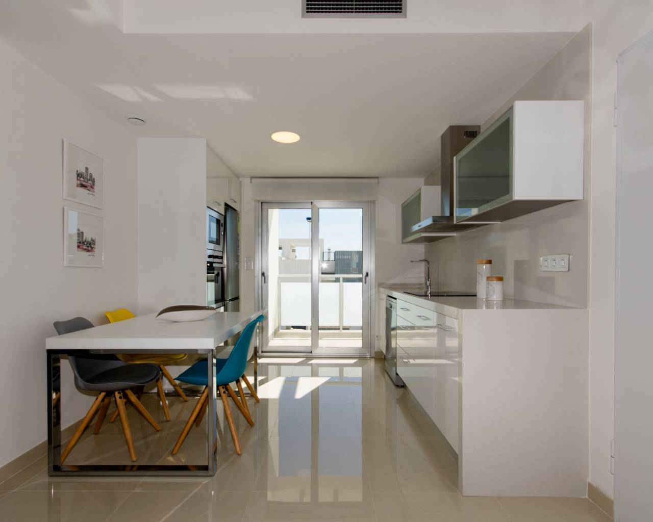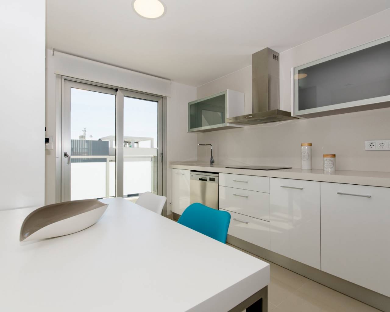 Dit penthouse-appartement met 3 slaapkamers is afgewerkt en instapklaar en bestaat uit een open woonkamer met openslaande deuren naar het terras, een moderne ingerichte keuken met witgoed inclusief oven, kookplaat, afzuigkap, koelkast/vriezer, wasmachine. , vaatwasser en magnetron, een hoofdslaapkamer met inbouwkasten en een en-suite badkamer met toegang tot het terras, nog twee tweepersoonsslaapkamers ook met inbouwkasten en een gastenbadkamer. Er is ook een trap die leidt naar het privé-solarium op het dak, waar u de hele dag kunt genieten van uitzicht op het zoutmeer en de zon.