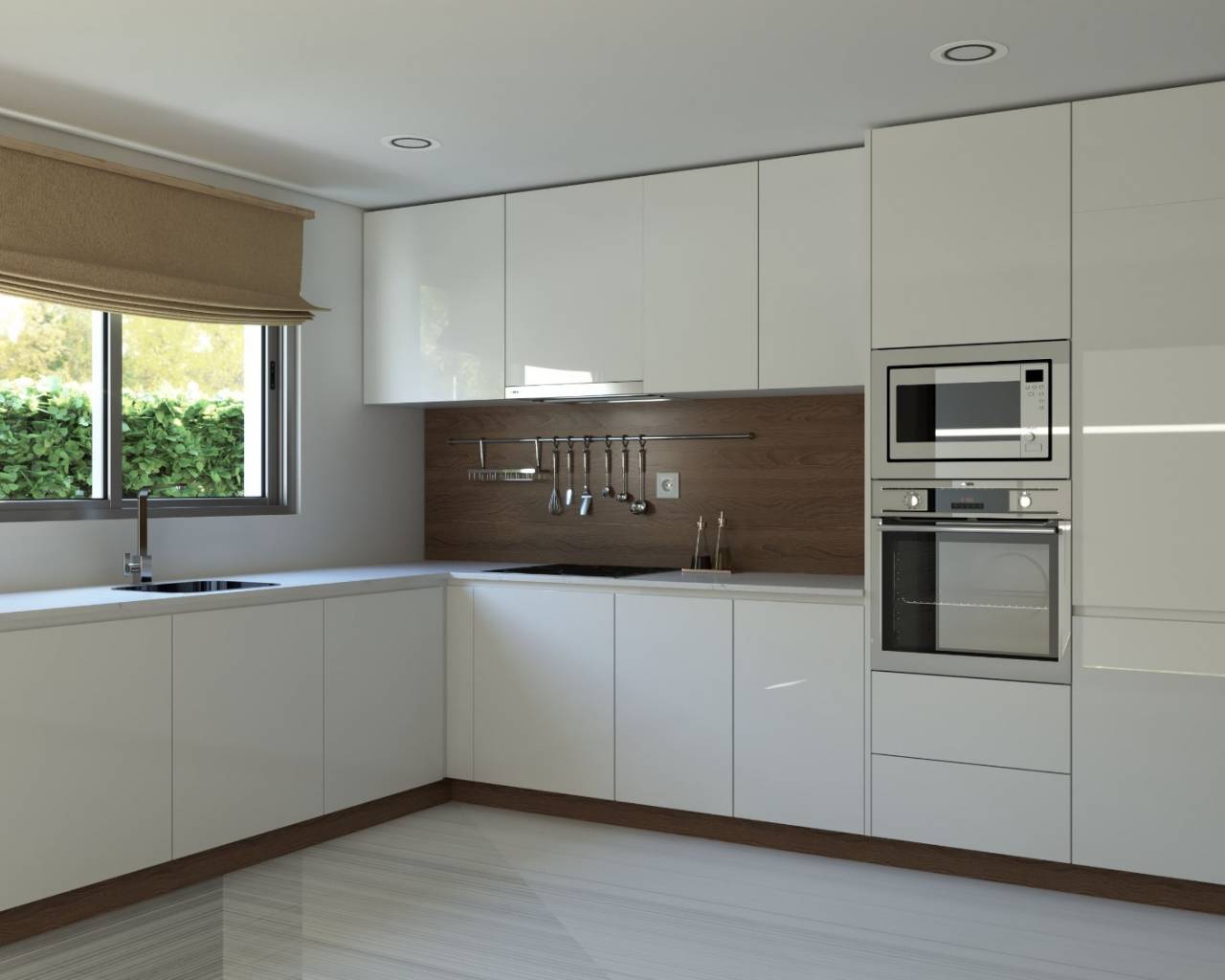 Deze luxe, gelijkvloerse villa bestaat uit een ruime woon-/eetkamer met toegang tot de tuin en het privézwembad, een open keuken met inbouwapparatuur zoals een oven, keramische kookplaat, afzuigkap, ingebouwde koel-vriescombinatie, vaatwasser, wasmachine en magnetron, een hoofdslaapkamer met inbouwkasten en een en-suite badkamer, twee extra slaapkamers met inbouwkasten en een complete badkamer. Een trap leidt naar een dakterras met een buitenkeuken.