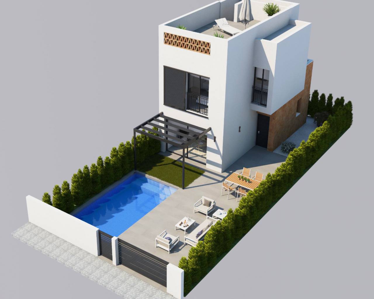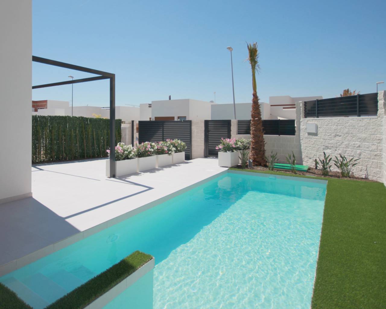 Deze turnkey villa is inclusief alle meubels, privé zwembad, warm/koud airconditioning, moderne keuken met inbouwapparatuur, solarium op het dak en alle verlichting.