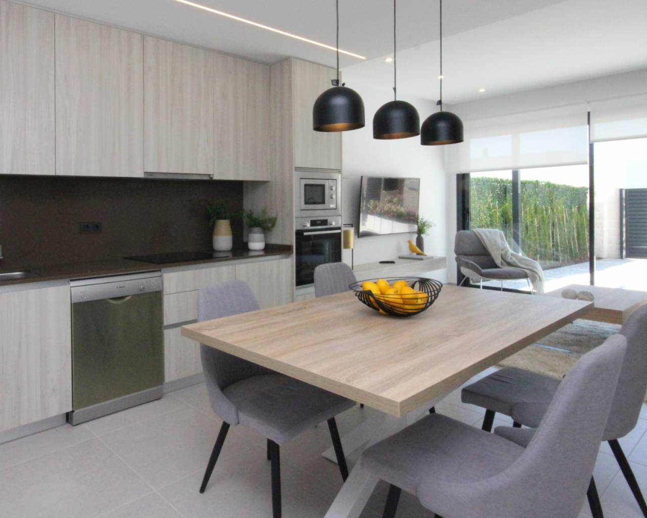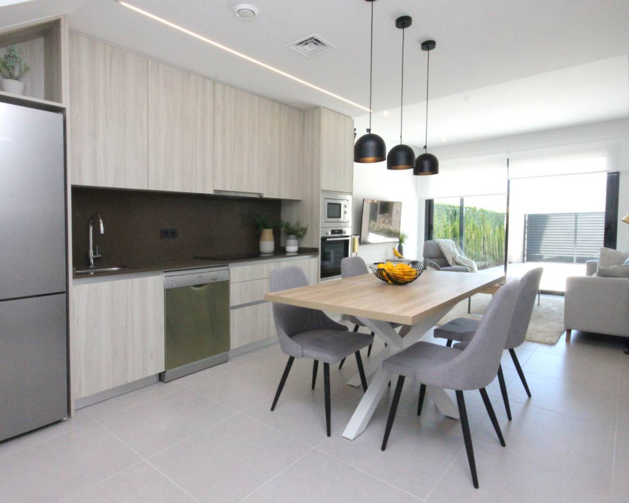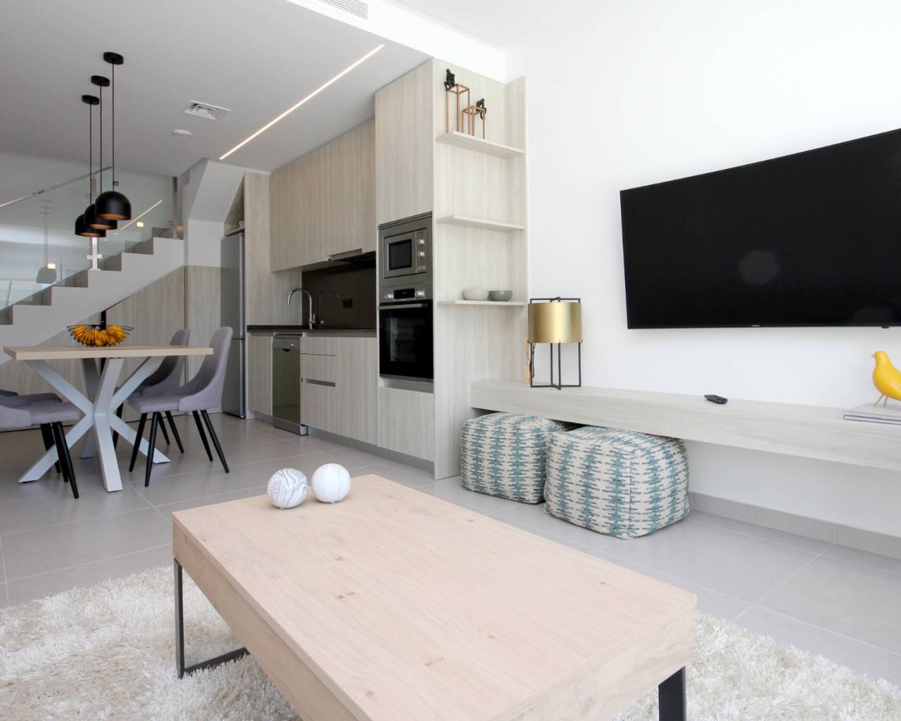 De begane grond van deze woning bestaat uit een ruime woonkamer met openslaande deuren naar de tuin met een privé zwembad, volledig ingerichte moderne keuken met inbouwapparatuur waaronder oven, kookplaat, afzuigkap, koelkast/vriezer, wasmachine, vaatwasser en magnetron, eethoek en een badkamer. .
