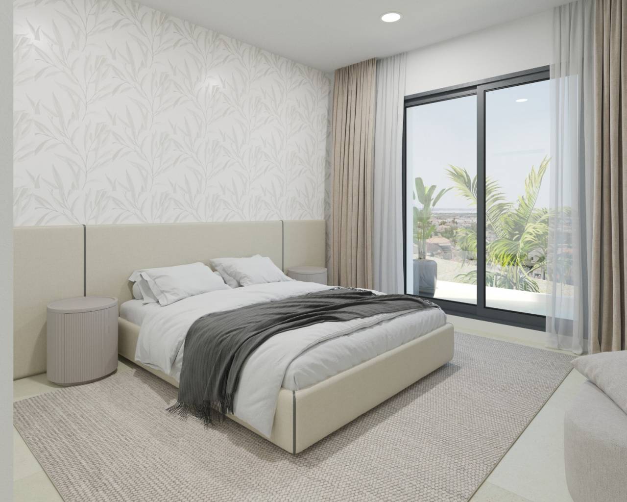 Een trap leidt naar de eerste verdieping, waar zich de ruime hoofdslaapkamer met inbouwkasten, een en-suite badkamer en een eigen zonneterras bevinden. Op de bovenverdieping bevindt zich ook een groot zonneterras.
