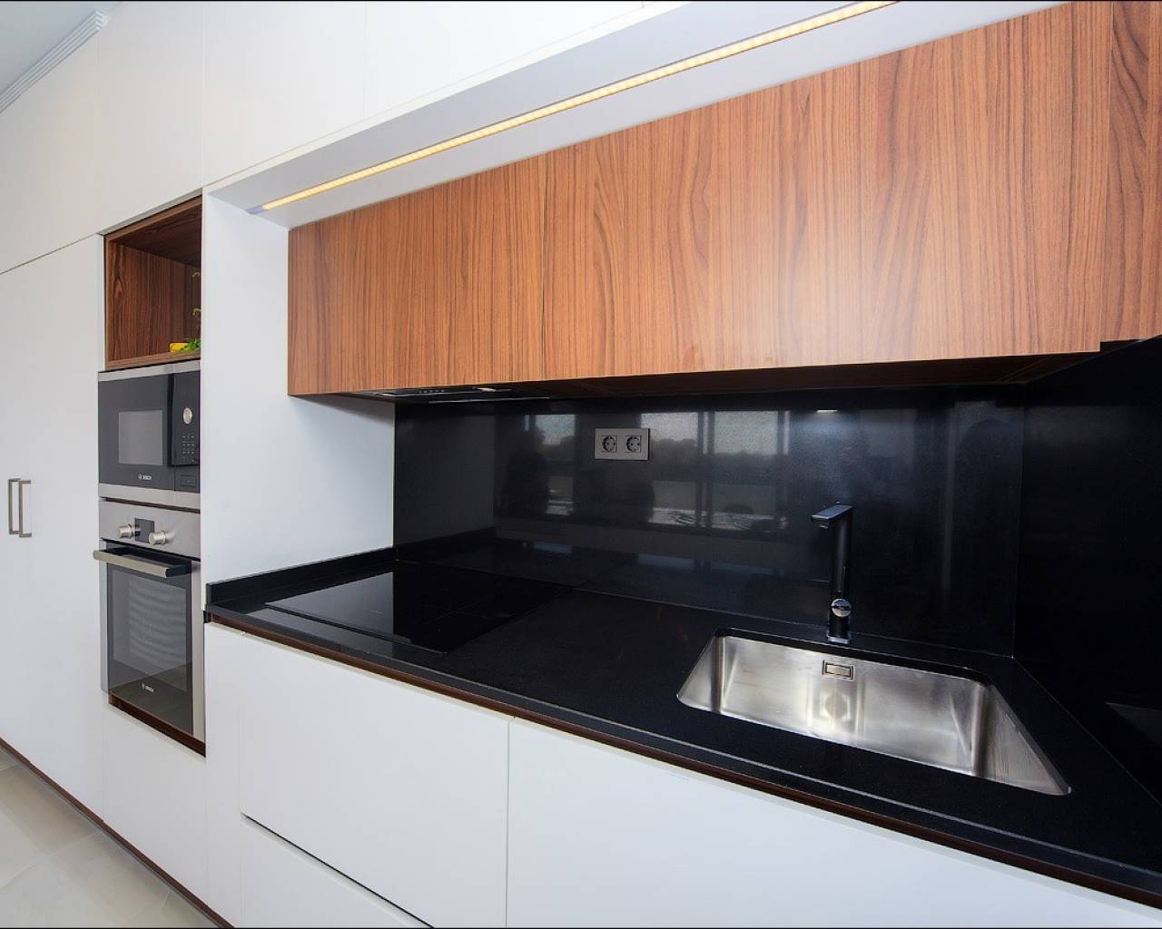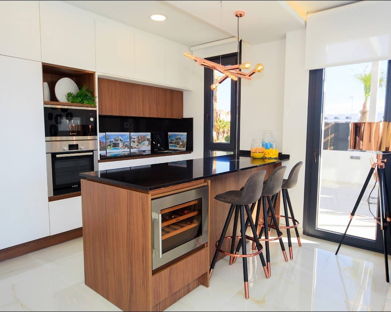 Deze luxe villa bestaat uit een woon/eetkamer met openslaande deuren naar de tuin met privé zwembad, een open keuken met Bosch inbouwapparatuur waaronder oven, kookplaat, afzuigkap, koelkast/vriezer, wasmachine, vaatwasser en magnetron, een ruime slaapkamer met inbouwkasten en een badkamer compleet met vloerverwarming.