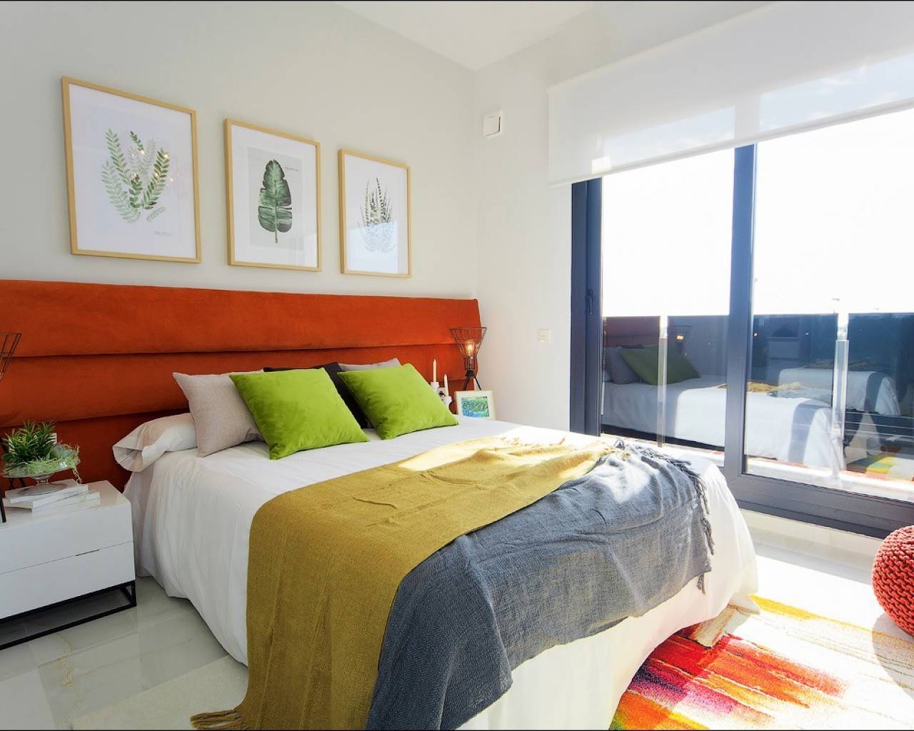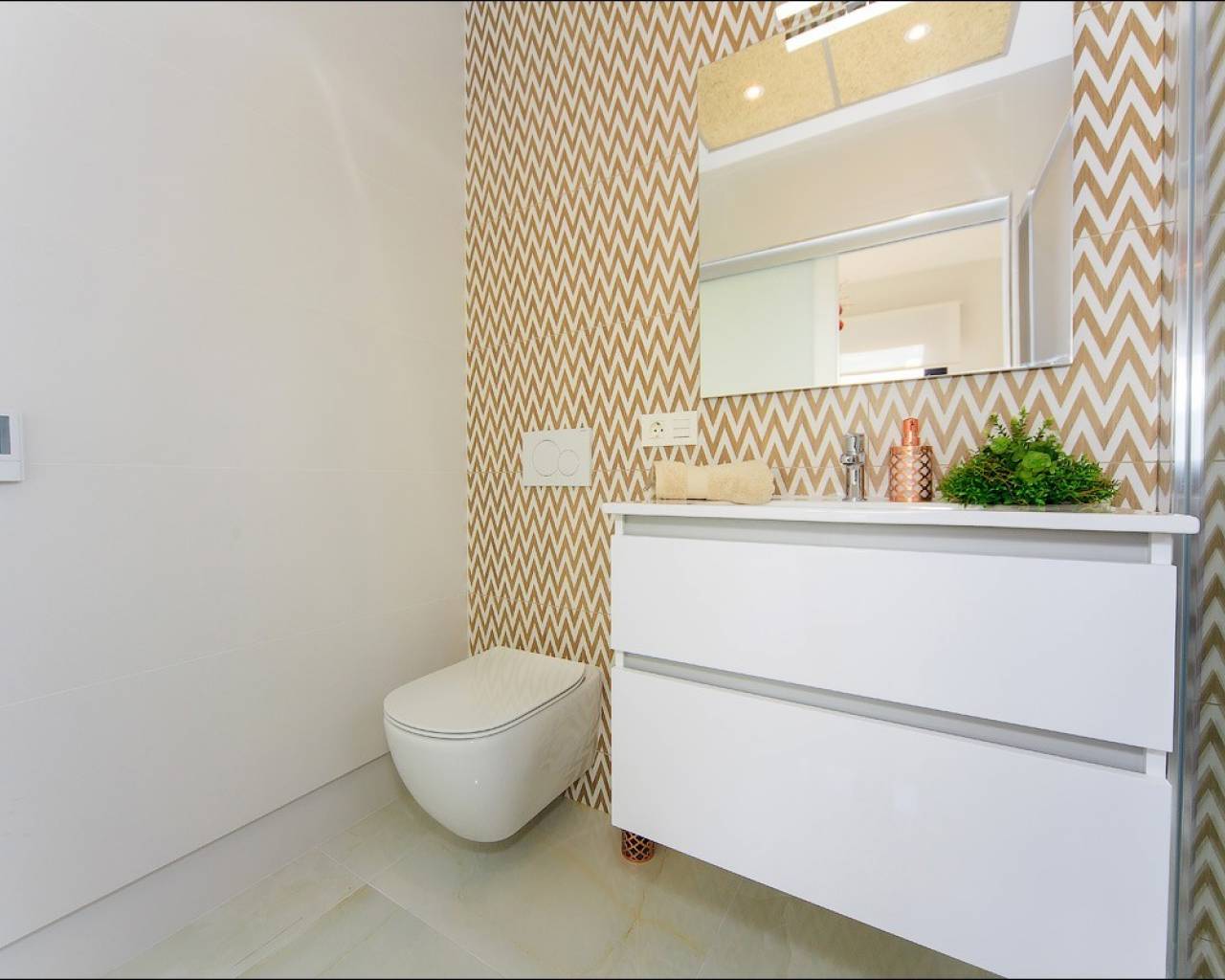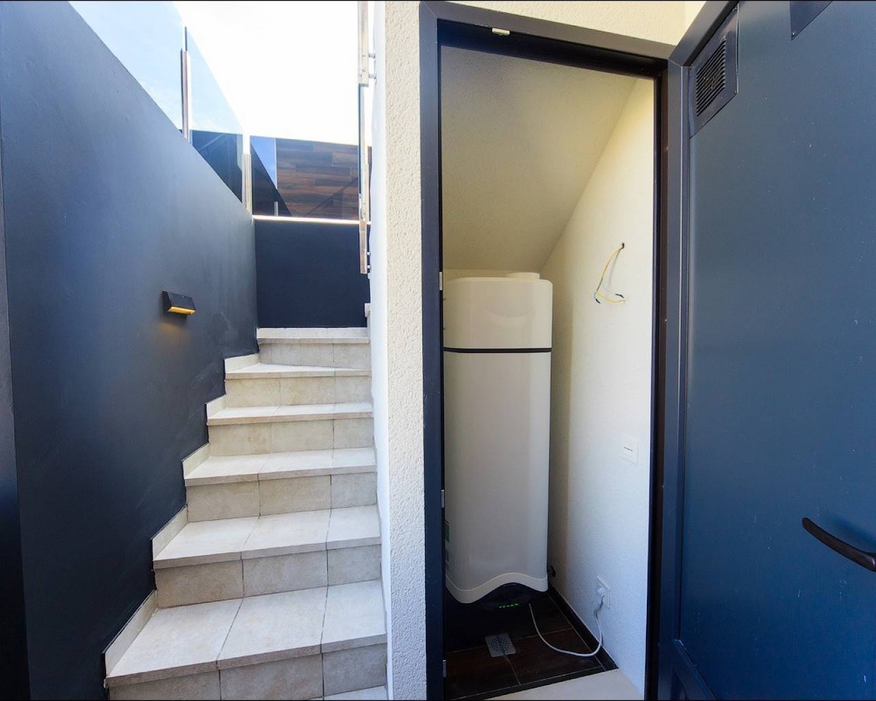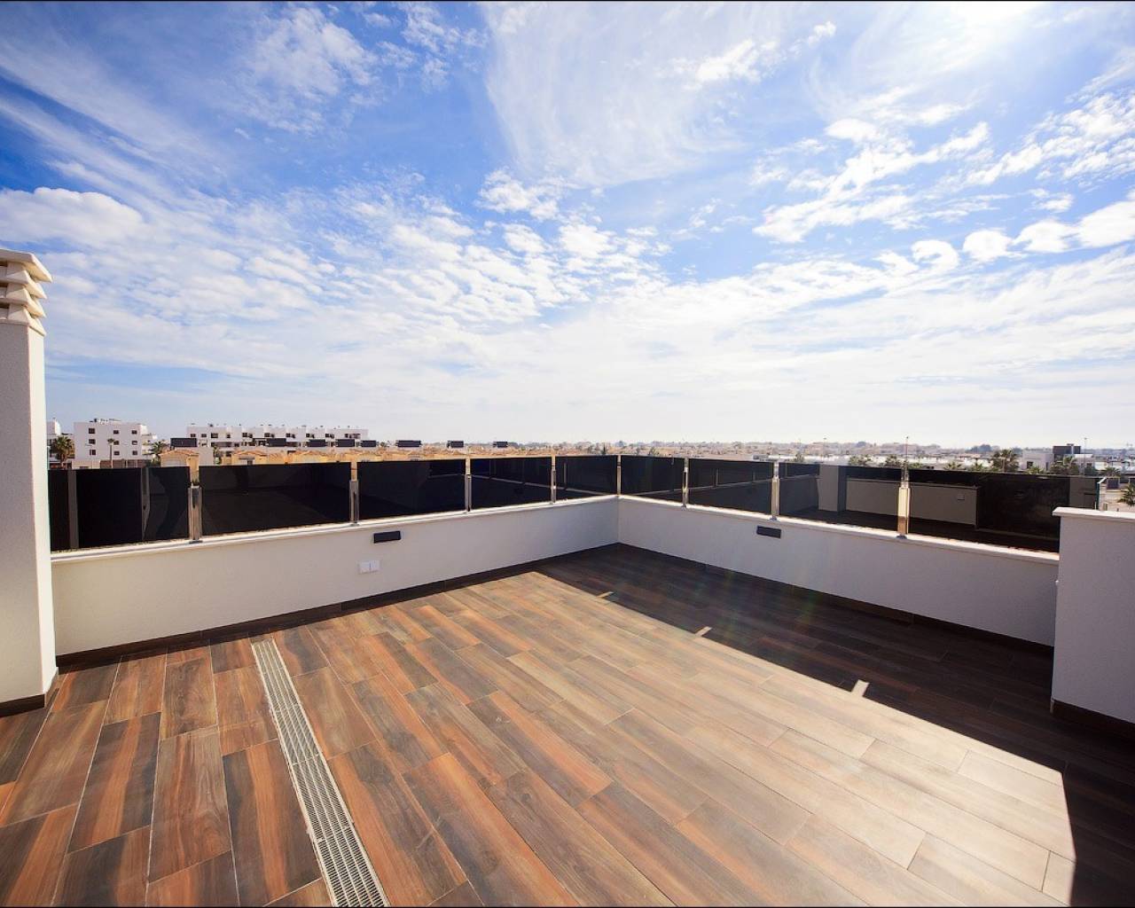 Een trap leidt naar de eerste verdieping waar u een tweepersoonsslaapkamer met inbouwkasten en en-suite badkamer vindt, nog een tweepersoonsslaapkamer ook met eigen inbouwkasten en badkamer en beide slaapkamers hebben toegang tot het boventerras. Er is een trap die naar het solarium op het dak leidt, waar u de hele dag kunt genieten van een prachtig uitzicht en zon.