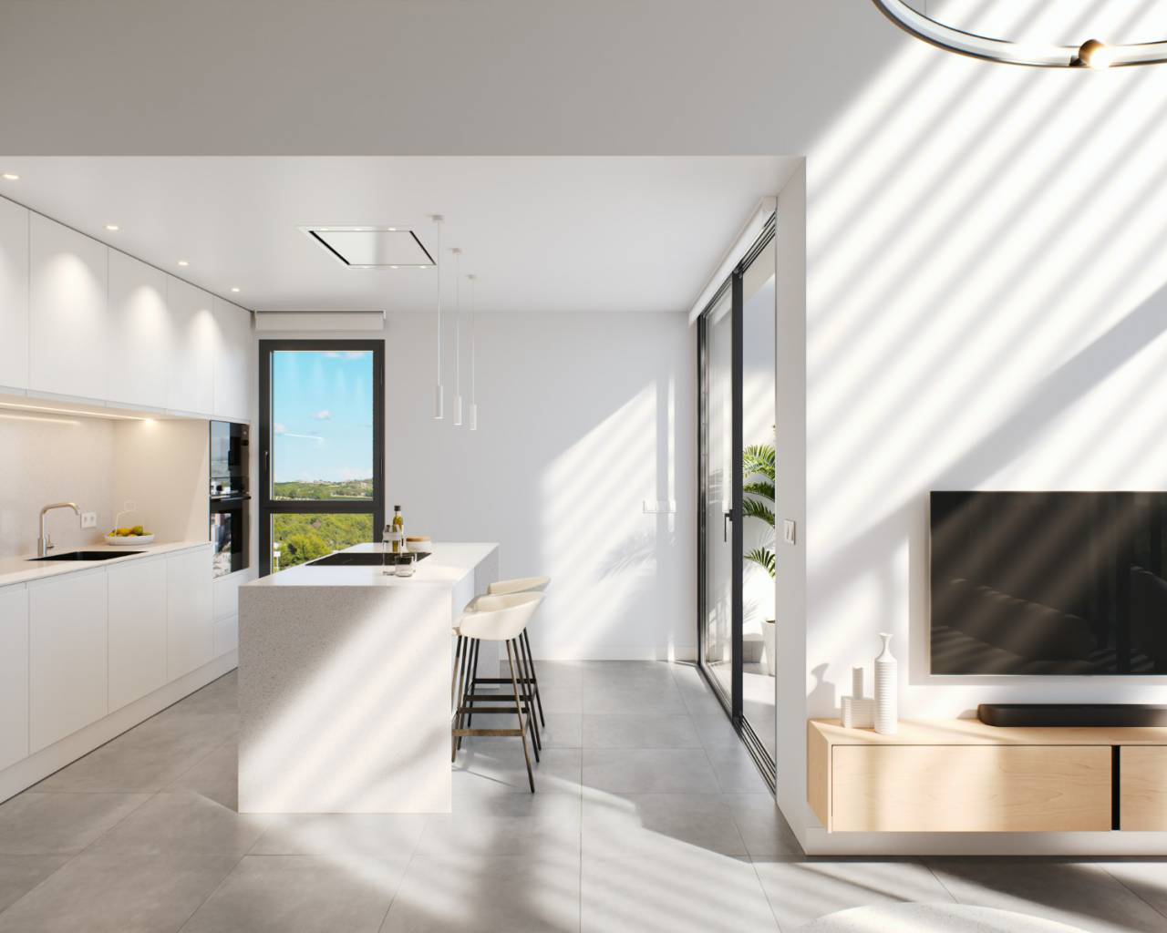 Dit appartement is afgewerkt volgens de hoogste standaard en omvat airconditioning warm/koud, keukenapparatuur, mooie gemeenschappelijke tuinen met palmbomen en zwembad en beveiligde ondergrondse parking met berging.