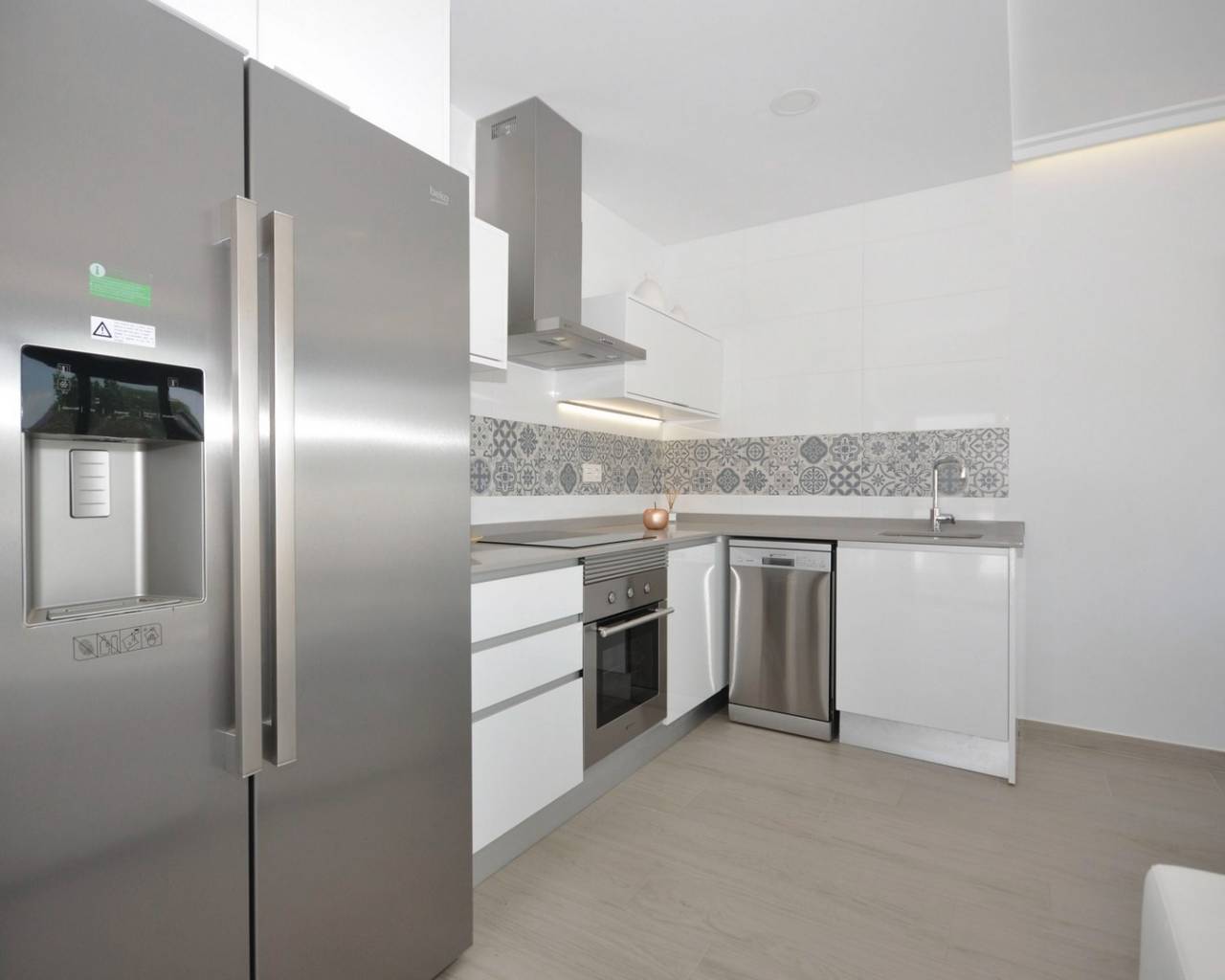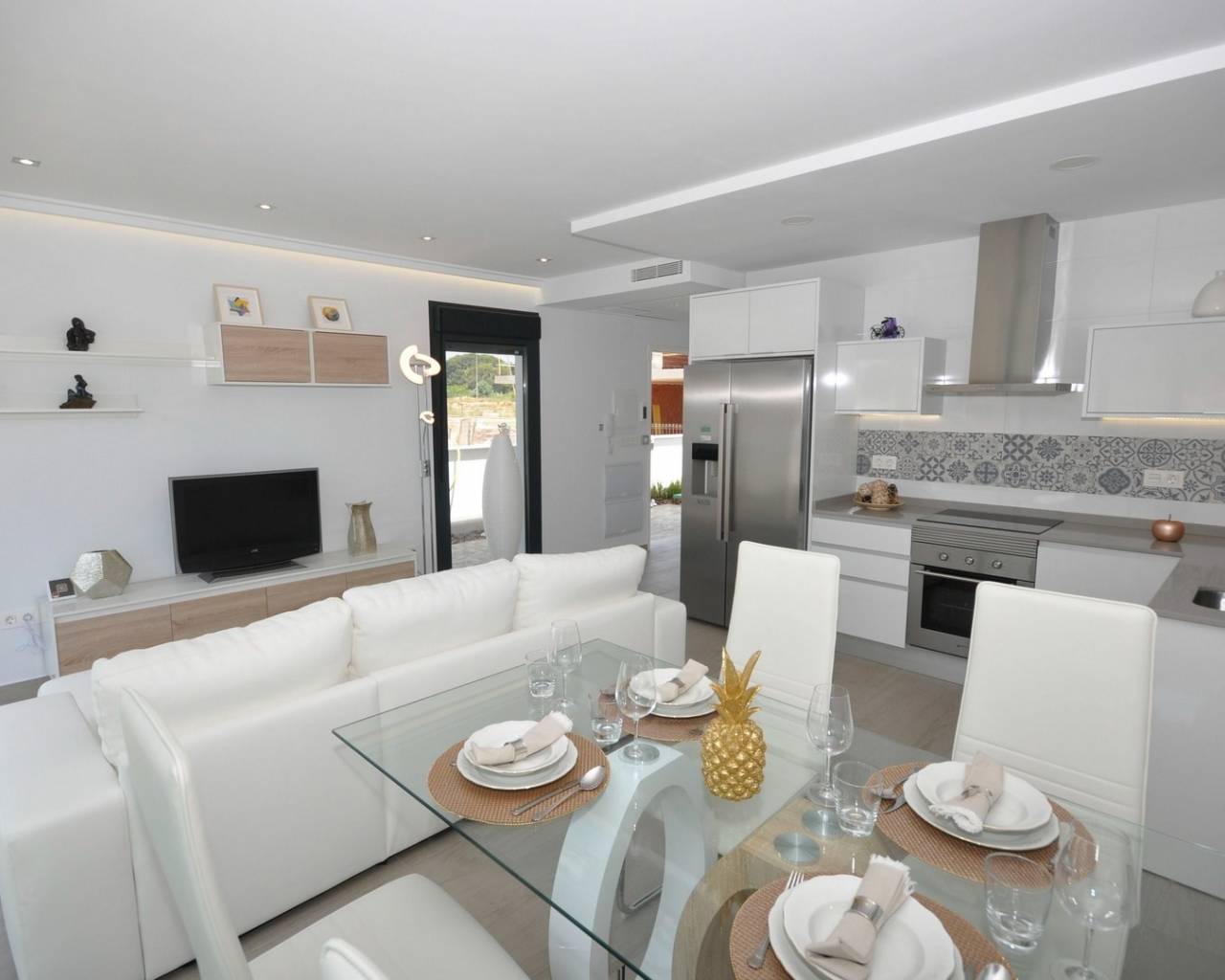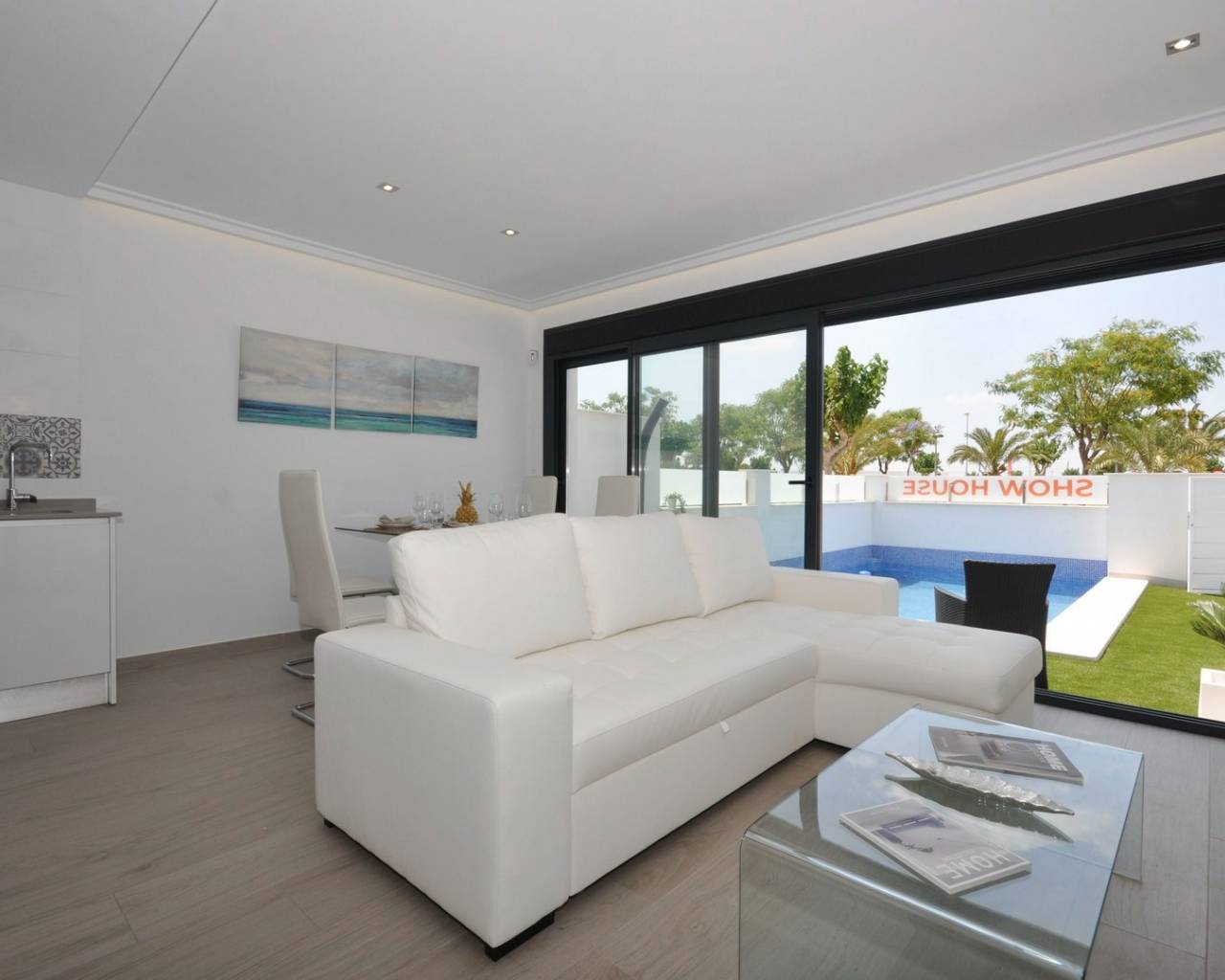 This luxurious villa has a lovely open plan lounge with patio doors which lead out into the private garden where you have the option to add a private pool, a modern kitchen with fitted appliances including oven, hob, extractor, fridge/freezer, washing machine, dishwasher and microwave, two double bedrooms with fitted wardrobes and a guest bathroom.