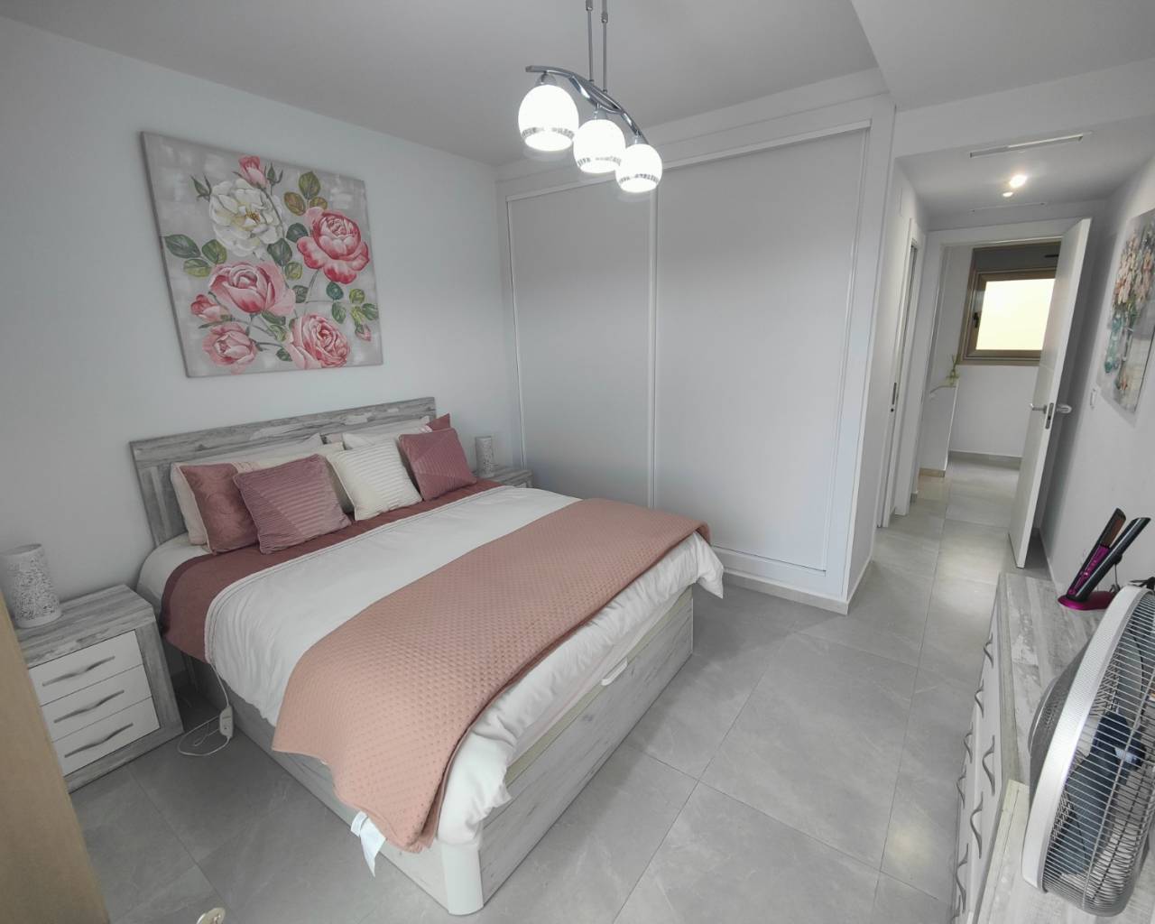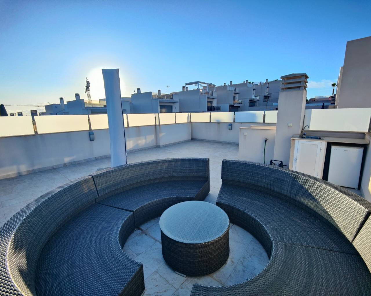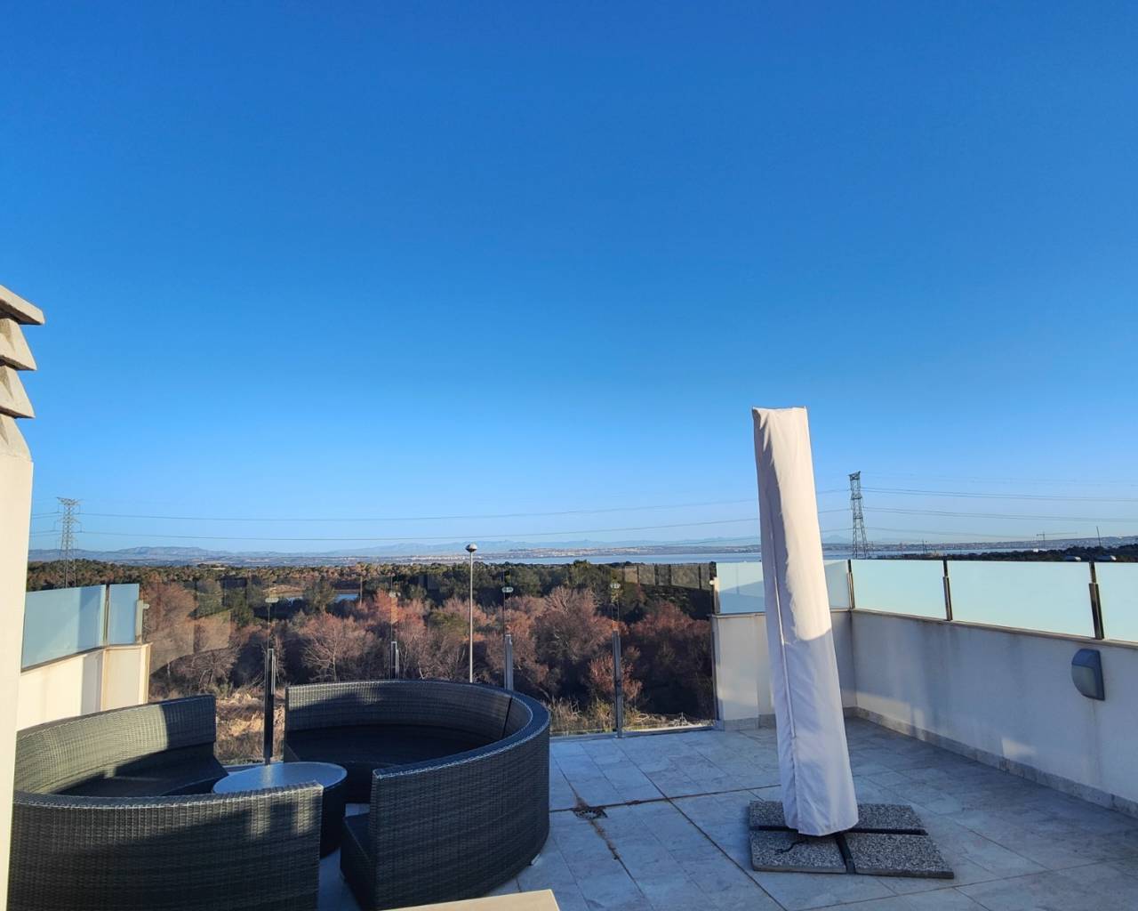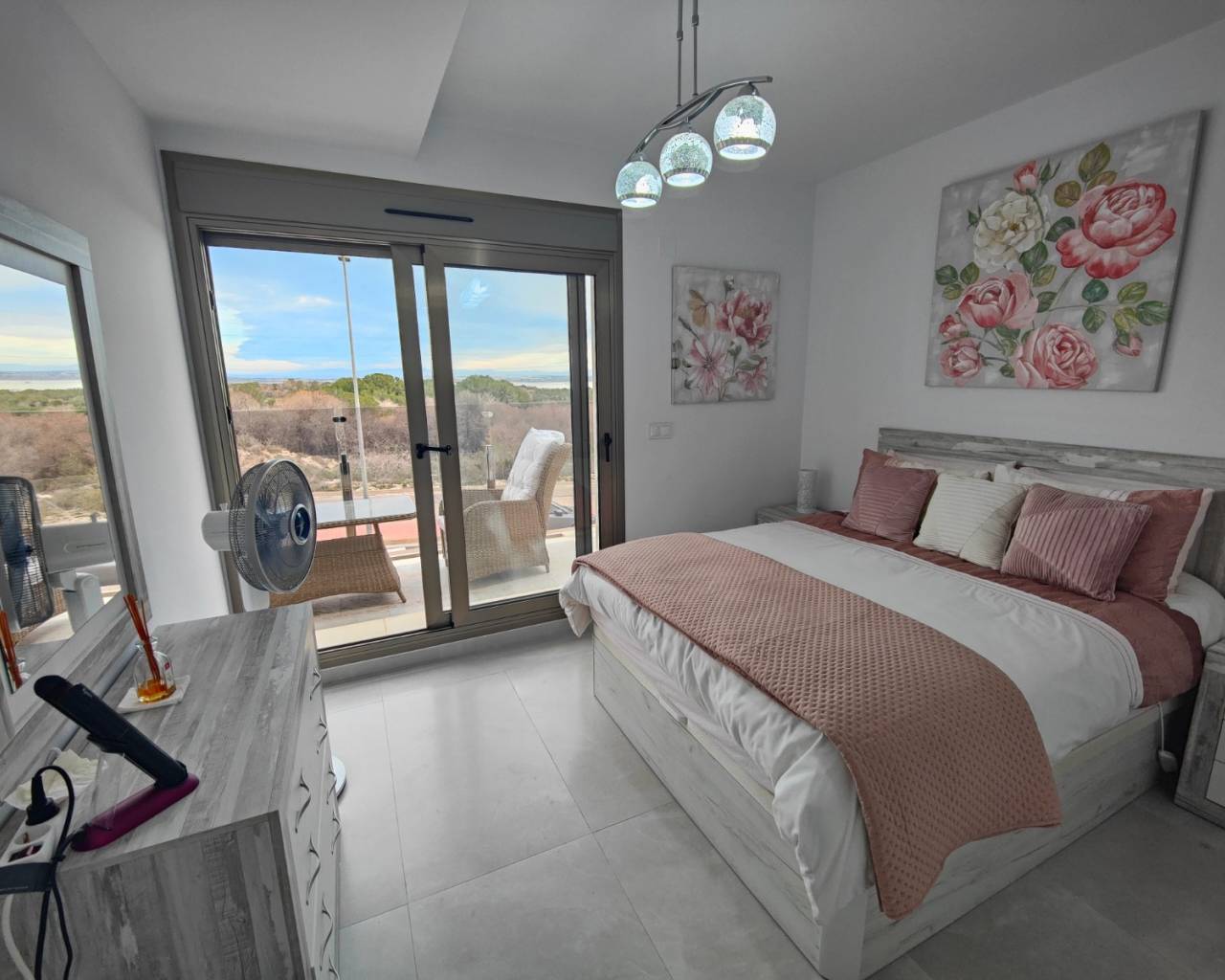 On the first floor there are two further double bedrooms with fitted wardrobes and each has an en suite bathroom and access to the sun terrace with views of the salt lake. There is an internal staircase which leads up to a large 49 m² rooftop solarium with have spectacular views of the Torrevieja salt lake.