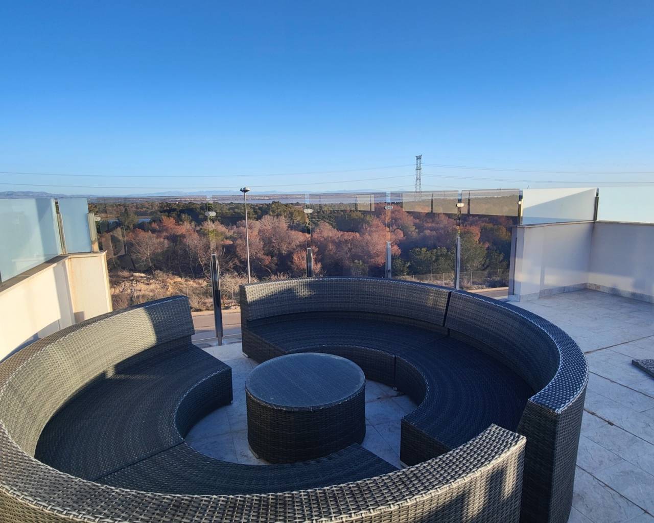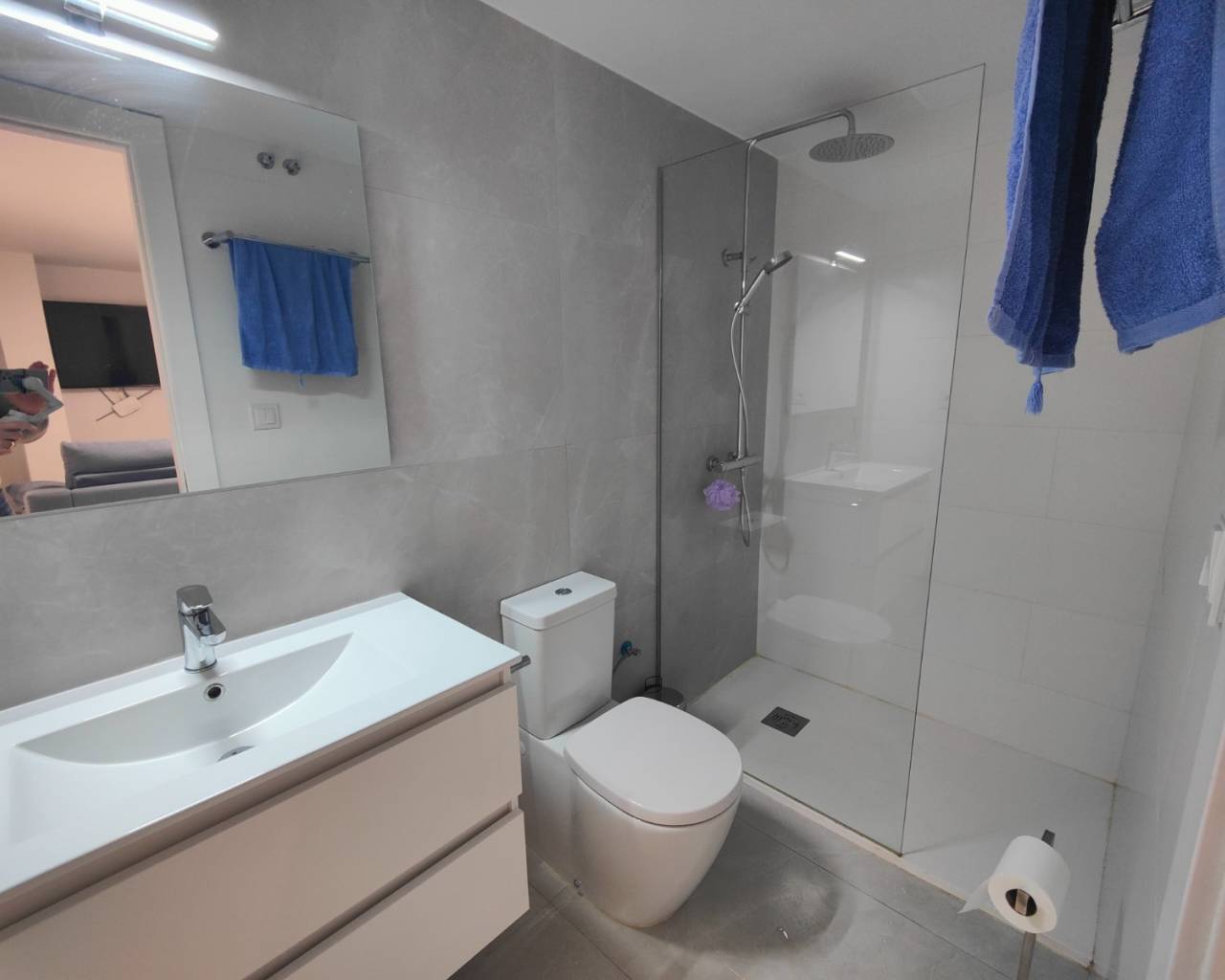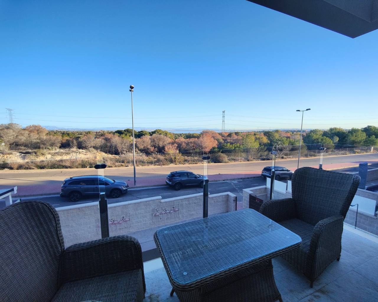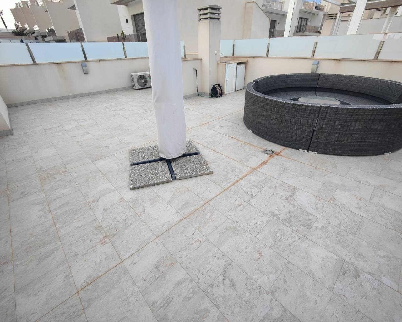 On the first floor there are two further double bedrooms with fitted wardrobes and each has an en suite bathroom and access to the sun terrace with views of the salt lake. There is an internal staircase which leads up to a large 49 m² rooftop solarium with have spectacular views of the Torrevieja salt lake.