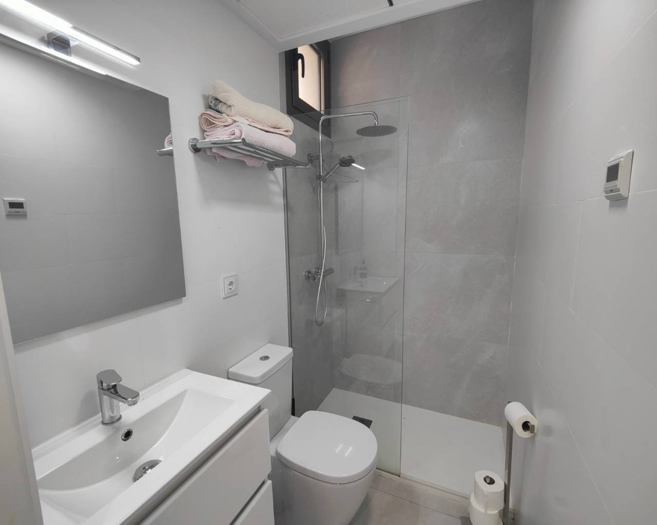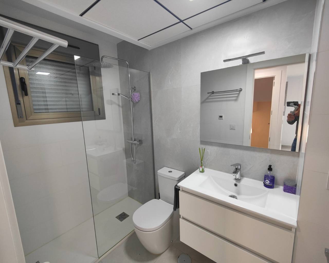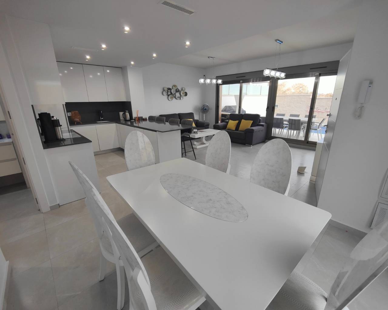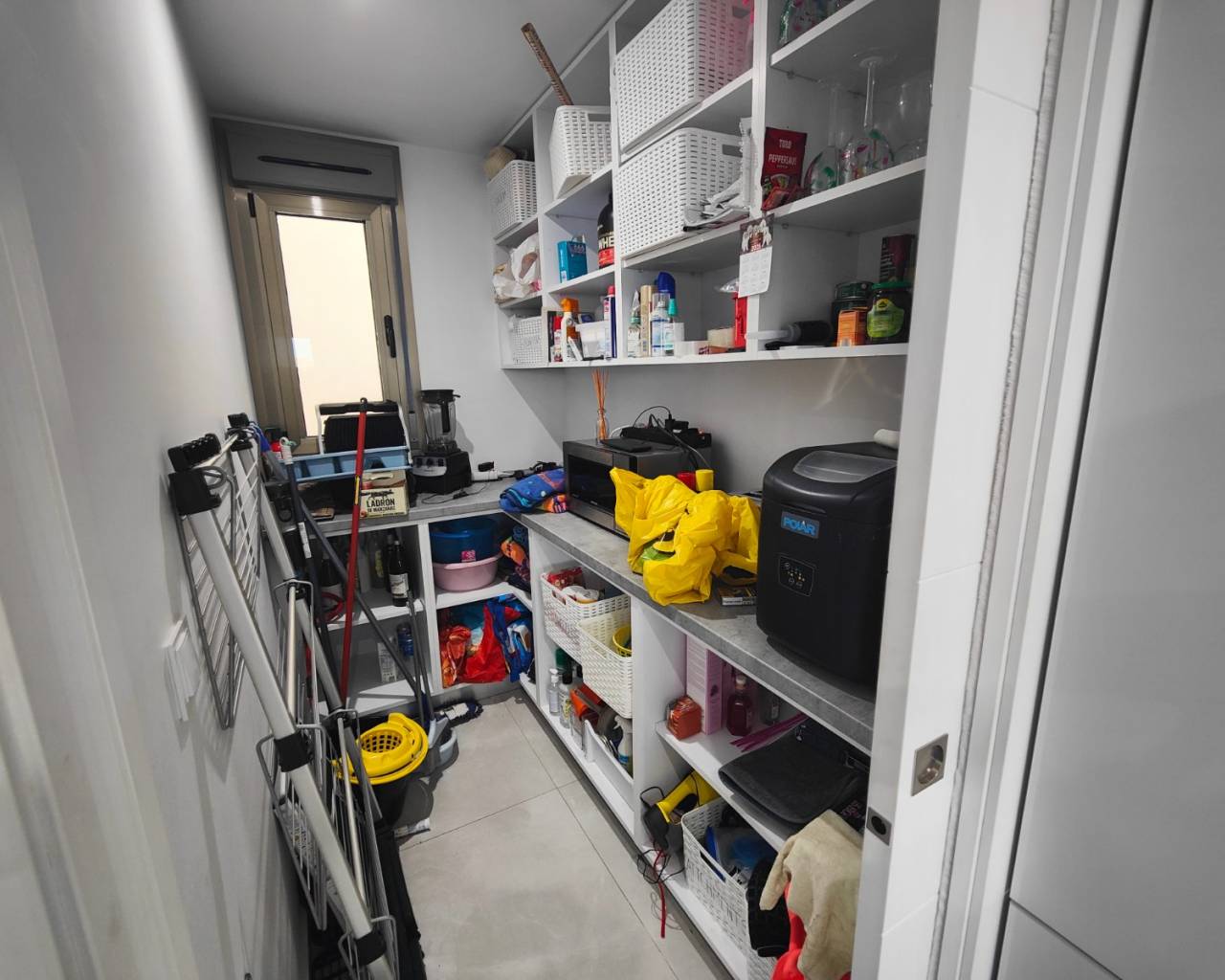 On the first floor there are two further double bedrooms with fitted wardrobes and each has an en suite bathroom and access to the sun terrace with views of the salt lake. There is an internal staircase which leads up to a large 49 m² rooftop solarium with have spectacular views of the Torrevieja salt lake.