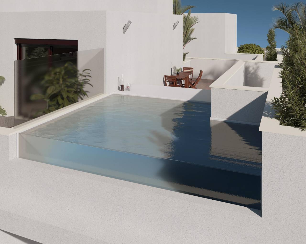 Included with this villa is indoor and outdoor lighting, under floor heating in the bathroom, kitchen and lounge, kitchen appliances, pre installation of air conditioning, fully fitted bathrooms and electric shutters.